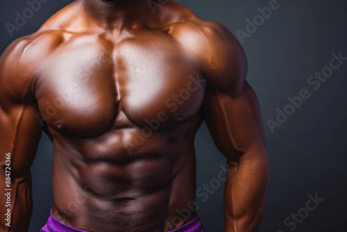 Male african american fitness model torso in purple top with well defined abdominal muscles