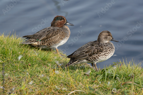 Male and female Common Teal (Anas crecca) on rocks beside the pond
