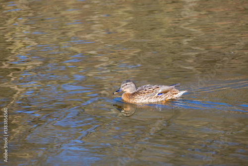 Male and female ducks swim in the water on a pond in the setting sun