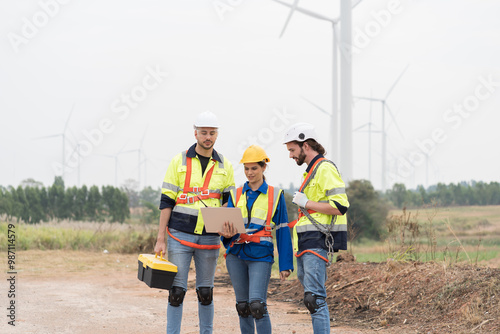 Male and female engineer at windmill field farm, wearing safety uniform and working and inspecting quality of wind turbines