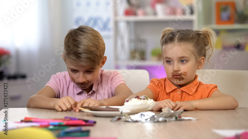 Male and female kids smeared with chocolate sitting at table, harmful food