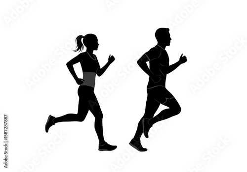 running, jogging, athlete, fitness, exercise, sport, health, lifestyle, active, outdoors, motion, speed, endurance, training, competition, marathon, track and field, cardio, silhouette, outline, male, female, man, woman, couple, together, activewear, illustration, graphic