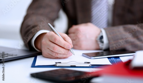 Male arm in suit and tie hold silver pen filling schedule in notepad at office workplace closeup. Legal law consult assistance gesture or finance investment advisor clerk job information gesture