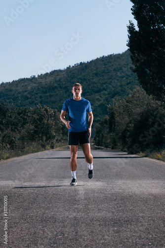 Male athlete running on an empty road in the woods while trying to get to the red finish line.