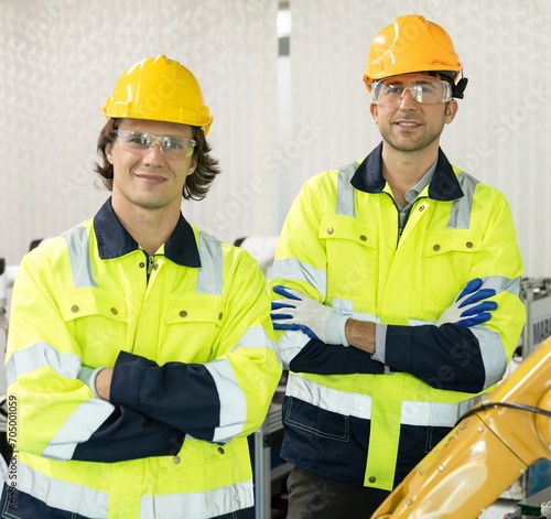 Male automation machine engineer students studying training Programmable logic controller Technical Industrial Engineer control robotics with monitoring system software, Automation robot arm.