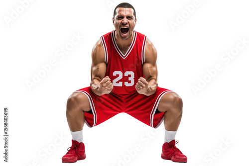 basketball, player, male, sport, athlete, game, uniform, red, action, competition, isolated, full body, screaming, energetic, athletic, active, fitness, healthy, team, professional, dynamic, power, emotion, victory, joy, celebrate, excited, strong