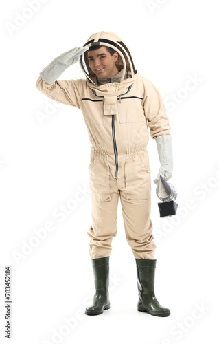 Male beekeeper with smoker on white background
