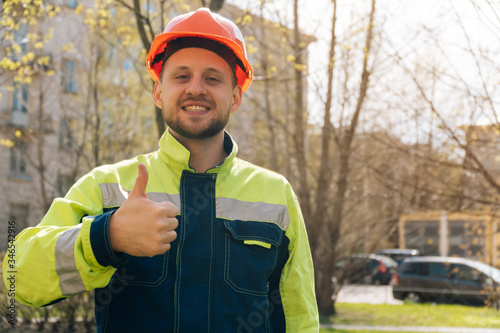 male builder in helmet shows class, holds thumb up. The concept of successful completion of construction. signing a contract