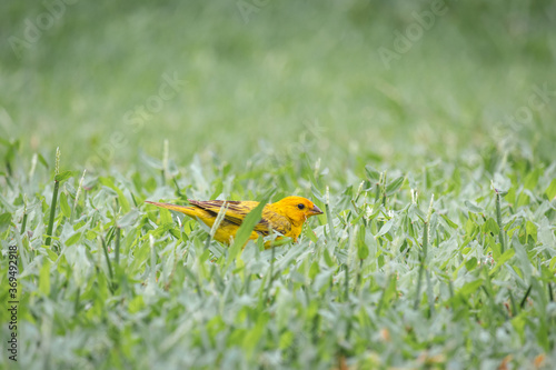 Male canario-da-terra eating seeds on the backyard. Yellow brasilian bird