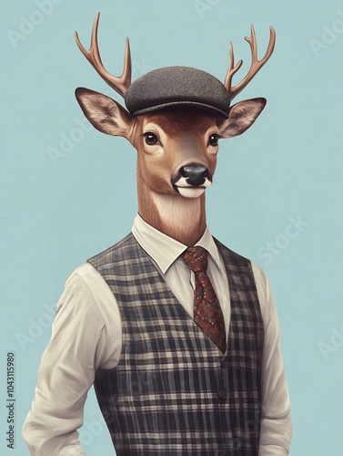 Male deer in a fitted vest with a flat cap on a light blue background.