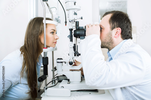 male doctor and a female patient, during a vision test, while in a medical clinic