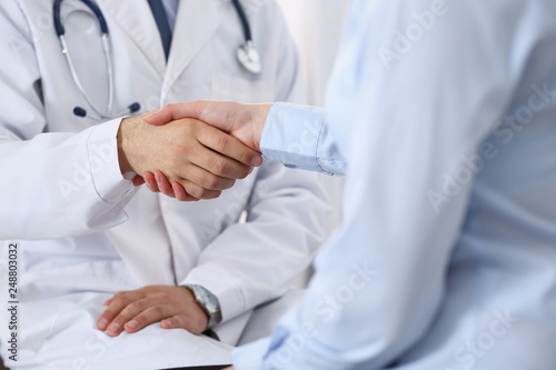 Male doctor and woman patient shaking hands. Partnership in medicine, trust and medical ethics concept