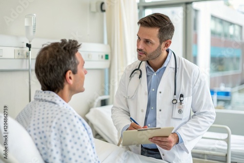 Male Doctor Consulting Patient in Modern Hospital Room for Professional Healthcare and Care