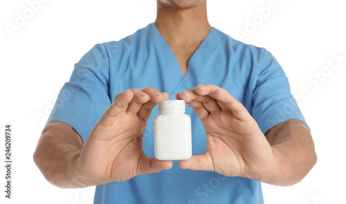 Male doctor holding pill bottle on white background, closeup with space for text. Medical object