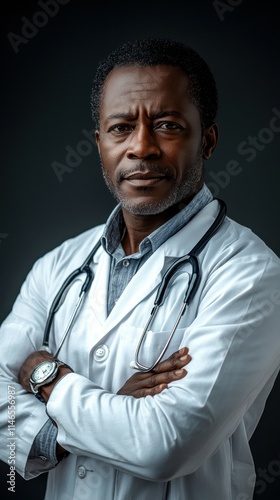male doctor resident of the Ivory Coast, 50 years old, very curly black hair, dressed in a white coat