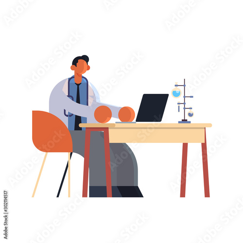 male doctor using laptop man researcher sitting at workplace desk with test tubes medicine healthcare concept hospital medical laboratory worker in white coat full length flat vector illustration
