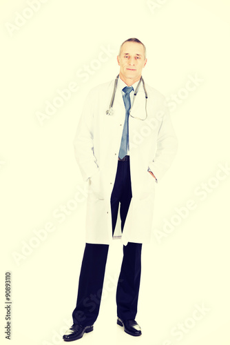 male, doctor, stethoscope, experienced, pocket, mature, old, 50s, elegant, smart, full-length, medicals, adult, caucasian, man, standing, health care, photogenic, people, medicine, smile, front, hospital, background, health, uniform, confident, studio, occupation, 1, care, person, professional, coat, confidence, men at work, healthy