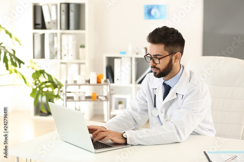 adult, appointment, care, caucasian, check, clinic, computer, make well, diagnose, diagnostic, disease, doctor, exam, health, help, hospital, ill, job, laptop, male, man, medic, medicals, modern, occupation, office, patient, people, person, physician, portrait, practitioner, profession, service, sick, sitting, symptom, table, technology, testing, treatment, using, working, young