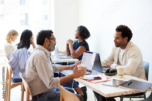 business, business meeting, businessman, businesswoman, cafes, chair, cafes, colleague, color image, communication, computer, consumerism, co-worker, client, day, discussion, entrepreneur, explaining, food and drink, horizontal, indoor, laptop, mature adult, new business, occupation, photo, planning, professional occupation, sitting, small business, strategy, table, teamwork, togetherness, wireless technology, working, los angeles, california, us, 30s, 50s, baby boomer, male, female, multiracial, asian, white, indian