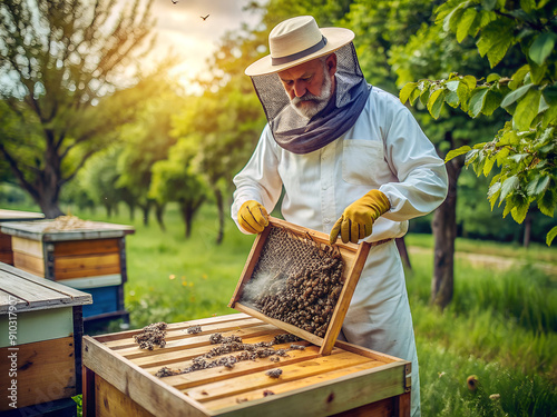 Male farmer with mustache and beard working in apiary against the background of a garden