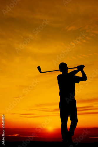 golf, golf course, golfer, man, action, control, determination, off, playing, power, scenic, silhouette, sport, sunset, swing