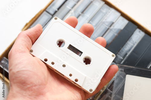 Male hand hold white audio cassette without markings. Box with tapes in background. Close-up shot