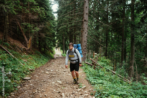 male hiker in casual clothes with a backpack on his back walks on a trail in the mountains during a hike.