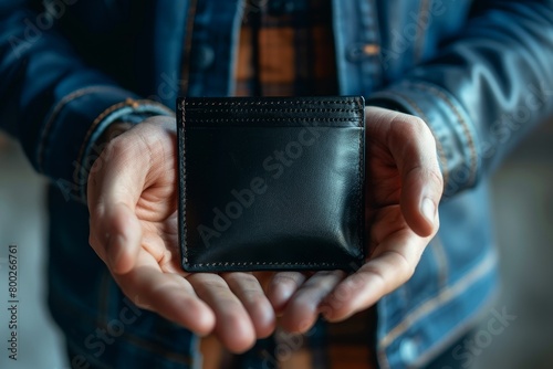 Male holds handmade black leather wallet Craft leather accessories advertising close up Elegant fashion holder