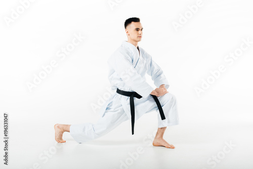 sport, activity, person, people, caucasian, action, male, man, strong, active, leg, sportive, exercise, exercising, sportsman, strength, alone, uniform, skill, photogenic, training, technique, defense, sporting, stretching, karate, fighter, practice, flexibility, sporty, kimono, isolated on white, copy space, studio shot, young adult, martial art, black belt
