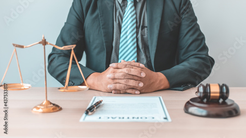 Male lawyer or judge sits and analyzes the case and decides the case with fairness, On the table were the scales of justice and the hammer of honest judgment, Concepts of Law and Legal services.