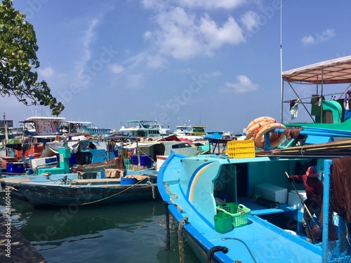 Male, Maldives - 20 December 2018: A lot of colored boats in the harbor of Male fish market