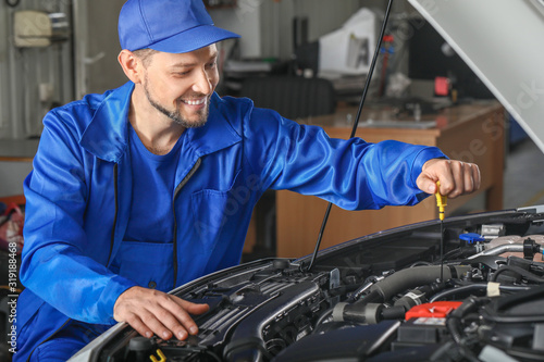 Male mechanic checking level of oil in car engine