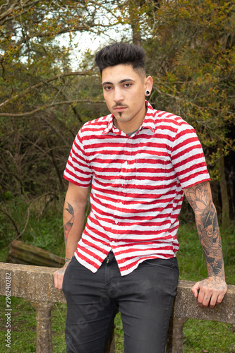 male model with mustache and barber tattoos
