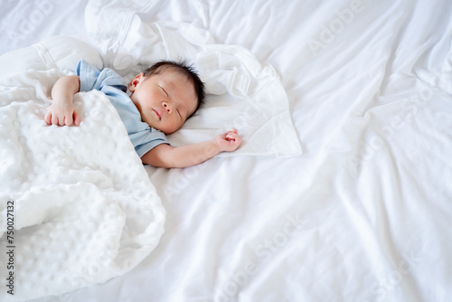 male newborn baby Is a person of Asian ethnicity Lying in the bedroom on a white bed