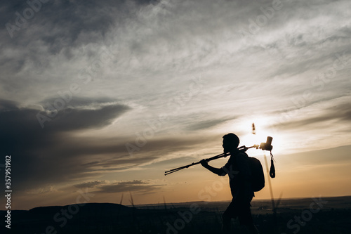 Male photographer in silhouette carrying on professional tripod and backpack while walking on hill. Amazing view of summer sunset. Concept of natural beauty.