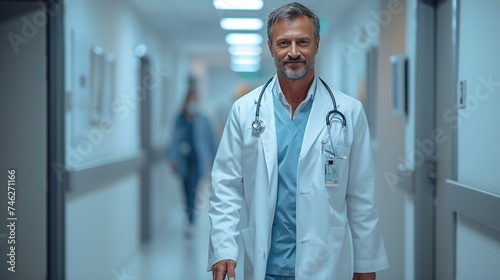 man, white, hospital, colours, portrait, camera, medicine, science, health care, person, on, adult, stethoscope, day, occupation, coat, corridor, laboratory, collection, differential, 55, 59, at, caucasian, document, ethnicity, sharpened, go, holding, indoor, looking, male, mature, 1, only, the, to, walking, wearing, year