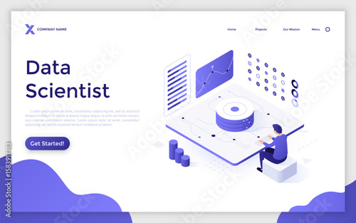 Male professional working with virtual information assets at desk. Data scientist landing page isometric template. Researching projects with big data creative 3d vector illustration for web page