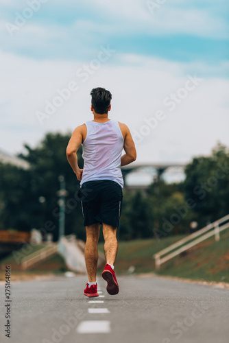 Male runner at sprinting speed training for marathon outdoors