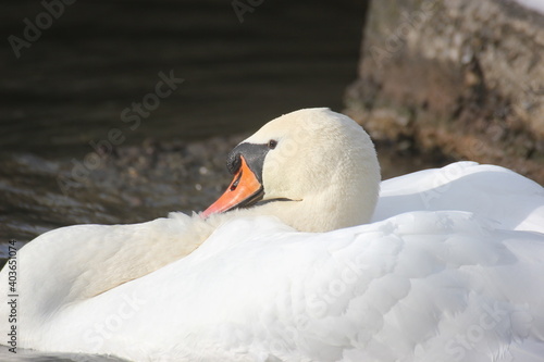 Male swan, posing for defending territorial on early afternoon. Close-up.