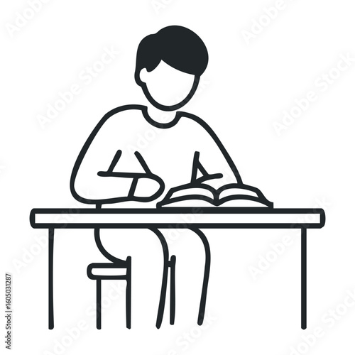 male, teenage, studying, desk, illustration, line, drawing, reading, book, education, student, learning, homework, sharpened, concentration, school, scholastic, academic, cognition, teenage, simple, minimalistic, seated, young, caucasian