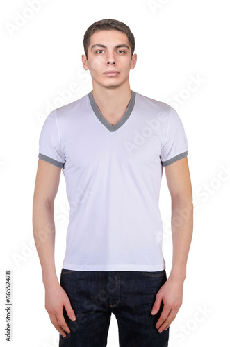 buttons, casual attire, closeup, clothing, collar, cotton, cut-out, cut-out, elegance, fashion, garment, isolated, male, man, model, modern, pattern, retail, sale, shirt, shopping, sleeve, style, t-shirt, textile, white, young