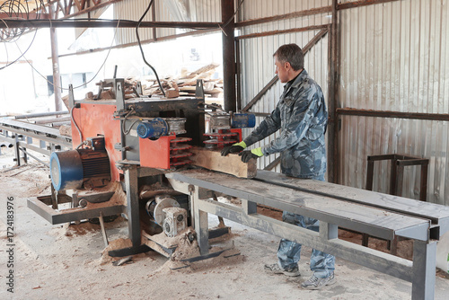 Male worker stands at woodworking machine. Woodworking company. Process of processing logs at sawmill. Sawing tree trunk. Sawmill.