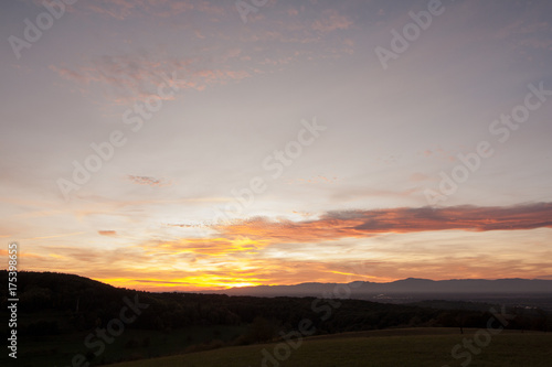 pretty, sunset, sun, downfall, sunset, far, dream, countless, forever, nature, wonder, panorama, mount, mountain, hill, vale, tree, meadow, dream, romantic, experience, black forest, evening, night, yellow, orange, blue, autumn, heaven, cloud, shadow, live, relaxation, travel, idyl, idylli, soothing, luck, happy, retired, pension, carefree, home, scenic, village