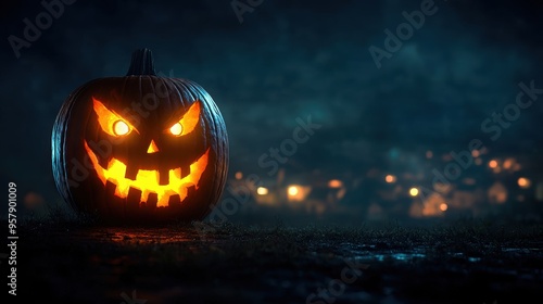 pumpkin, monster, glowing, eye, jagged, mouth, towering, village, dusk, halloween, skittish, creature, scarey, menacing, evil, horror, fantasy, mystical, supernatural, digital, art, ultra, hd, selective, sharpened, foreground, copy, space, creepy, night, dark, atmospheric