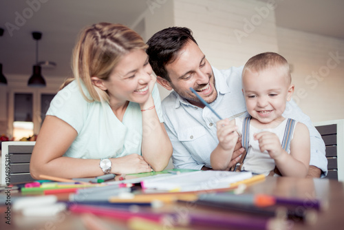 Mam and dad with child drawing at home