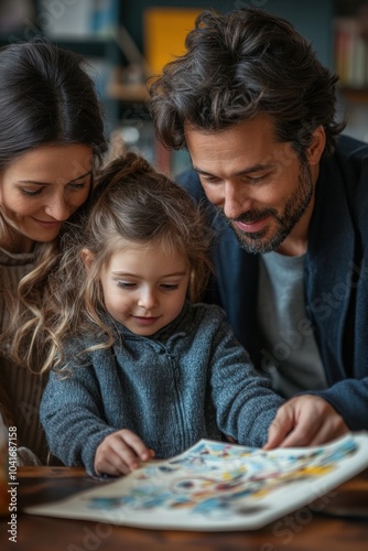 Man and woman and a child looking at a book