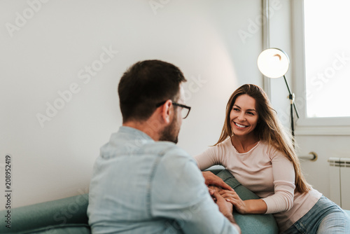 couple, woman, man, talking, happy, home, meeting, young, looking, love, date, marriage, smiling, sitting, girlfriend, couch, wife, lifestyle, conversation, sofa, dating, girl, boyfriend, casual attire, apartment, room, human relationships, adult