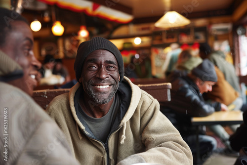 man, hoodie, table, eatery, warm, light, lively, atmosphere, dining, cosy, realistic, food, drink, indoor, happy, casual attire, urban, culture, people, candid, cinematic, storytelling, detailed, mood, ambience, sharpened, comfort, background, night, social, relaxed, vibrant, meal, plate, bokeh, character, friendly, expressive, evening, modern, dynamic, authentic