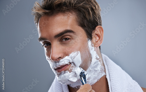 Man, blade and shaving beard in studio closeup for grooming, skincare and portrait by grey background. Person, model and self care with cream, facial hair removal and product for cosmetic change