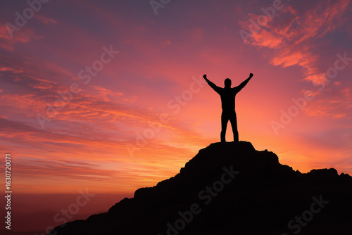 Man Celebrating on Top of a Rocky Peak at Dawn